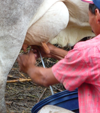 --Retire la primera porción de leche y observe por signos de dolor, y por la presencia de coágulos, fibras o aguado de la leche. Para reducir la transmisión de mastitis, los primeros chorros de leche nunca deben ser recibidos en la mano. En el establo, una taza especial debe ser utilizada y lavada cuidadosamente entre cada vaca. En un corral de ordeño, los primeros chorros de leche pueden ser arrojados directamente en el piso y lavados con agua tan pronto como han sido observados.